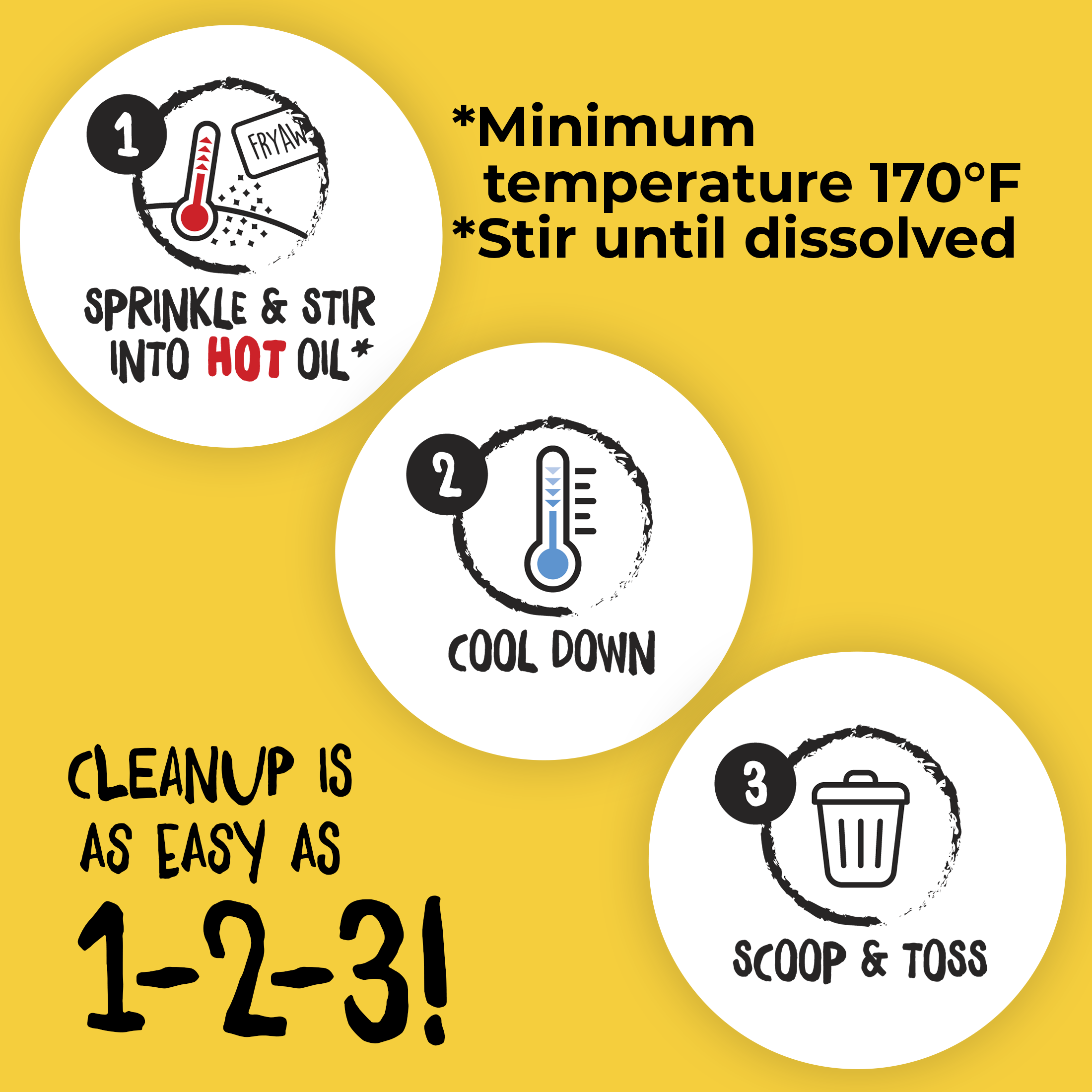 1) Sprinkle FryAway directly into the hot oil and stir to dissolve.