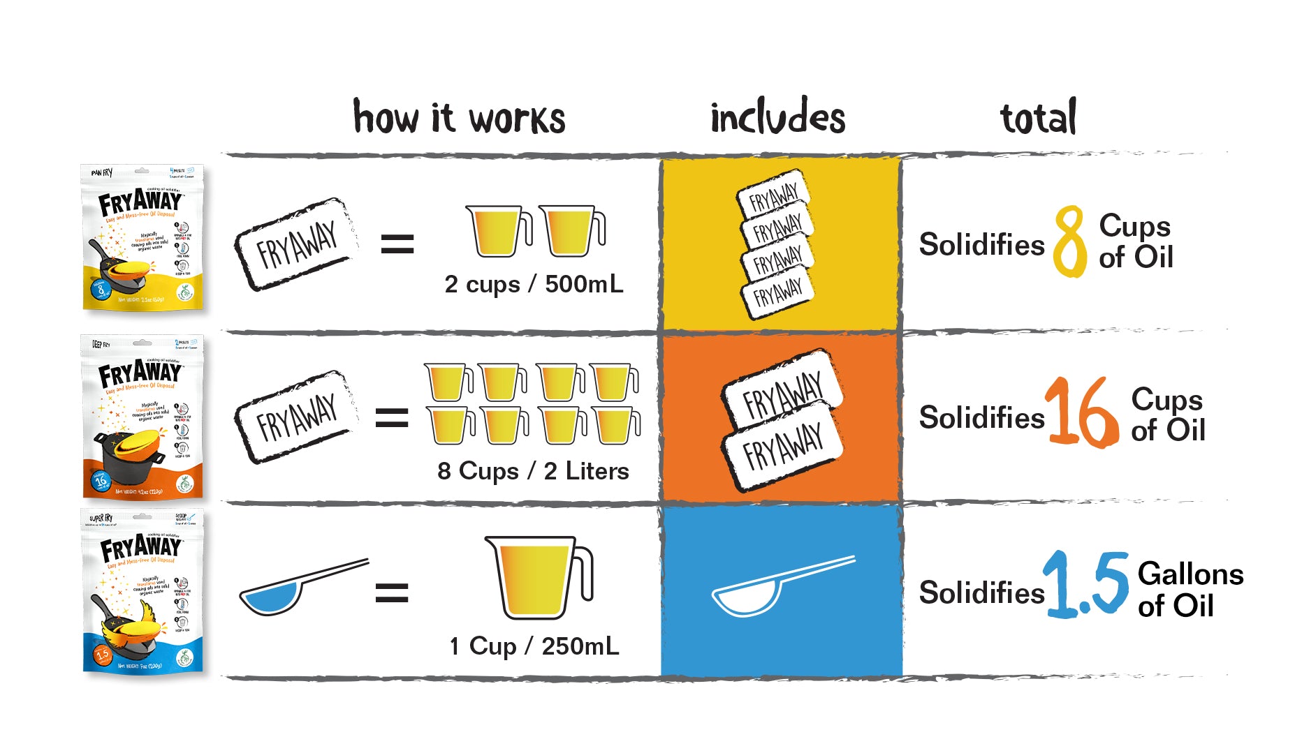 FryAway magically transforms used cooking oil into solid organic waste in three easy steps. Just Sprinkle, Cool down and Toss Away your used cooking oil.