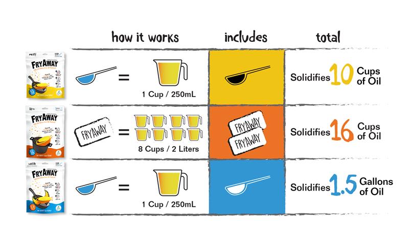 FryAway magically transforms used cooking oil into solid organic waste in three easy steps. Just Sprinkle, Cool down and Toss Away your used cooking oil.