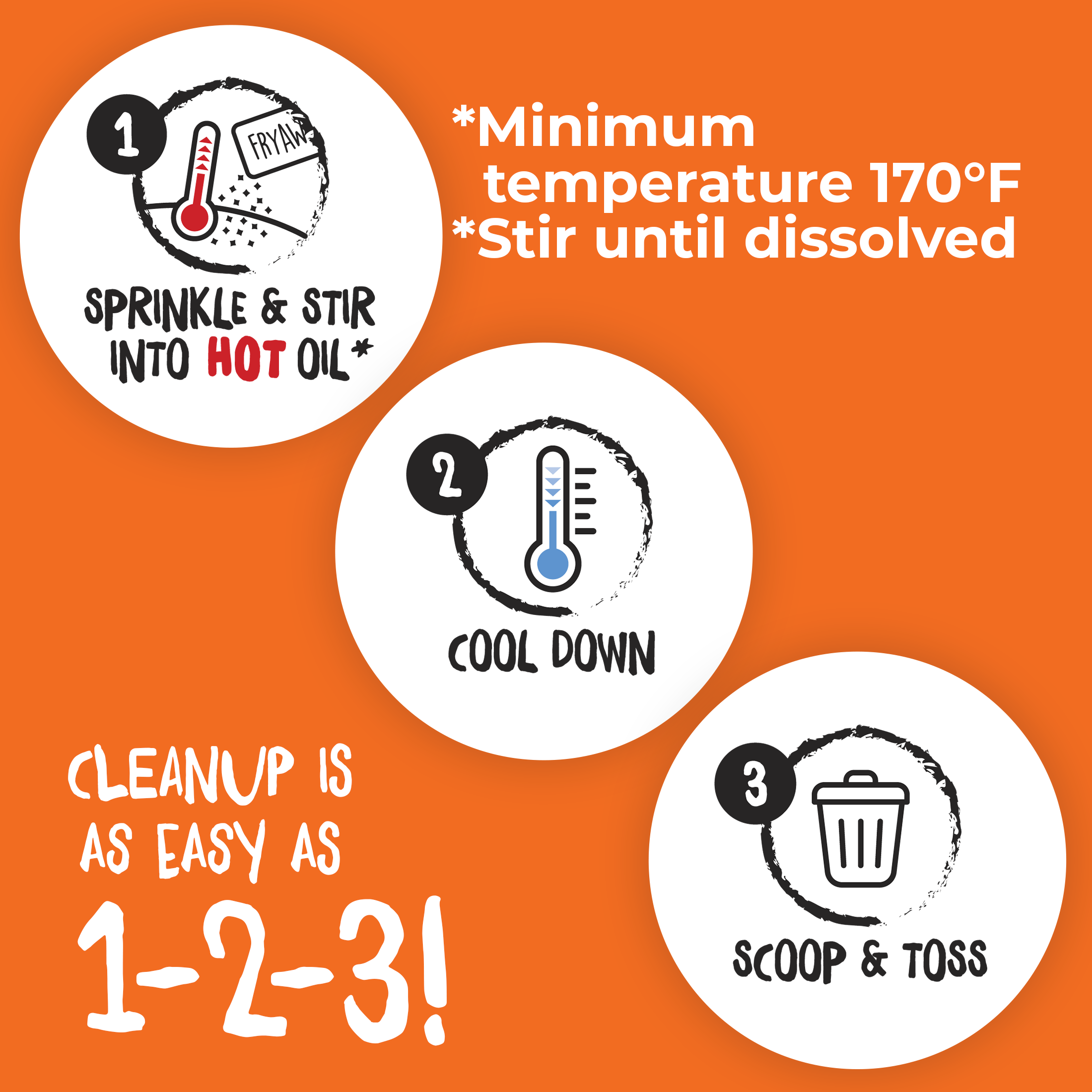 1) Sprinkle FryAway directly into the hot oil and stir to dissolve.